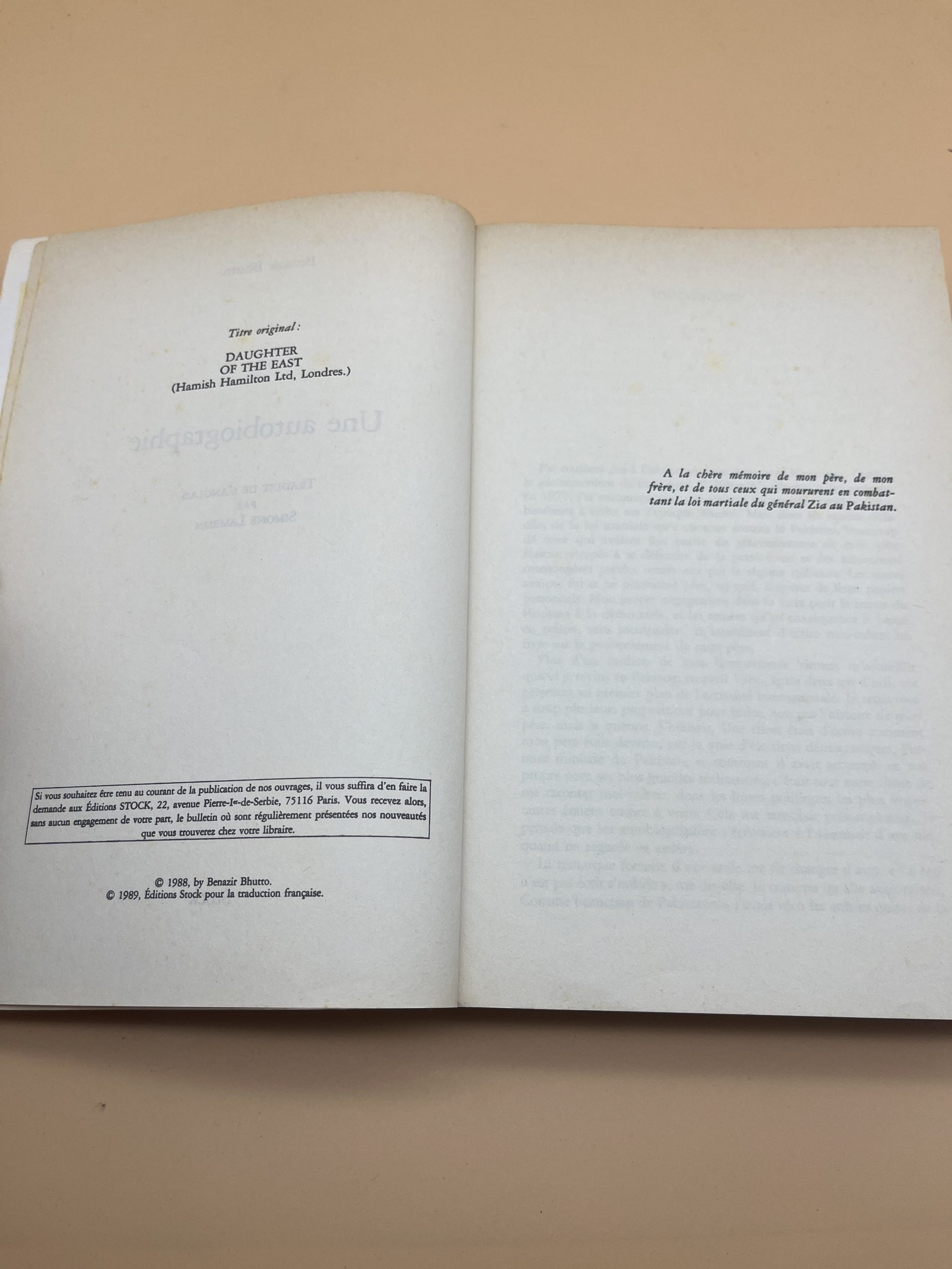 Autobiographie de Benazir Bhutto en français chez Stock; parcours politique et intime.