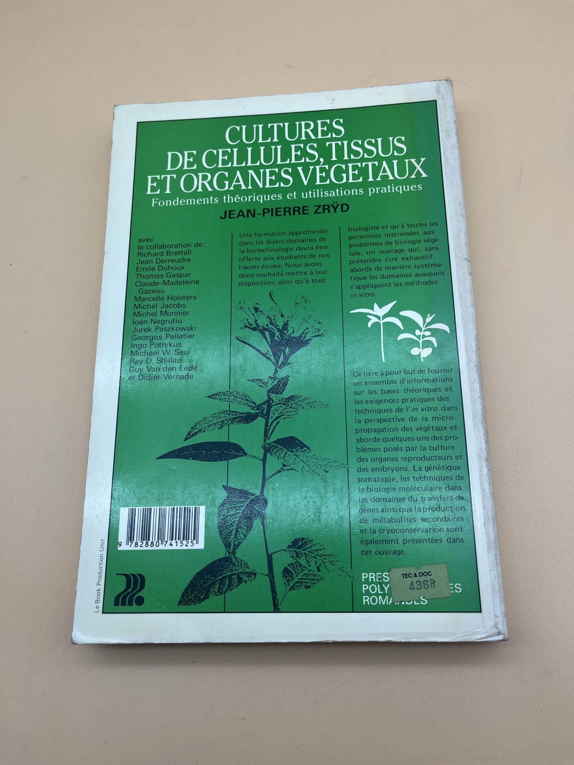 Livre scientifique « Cultures de cellules, tissus et organes végétaux » par J.-P. Zrÿd (PPUR, 1988). Biotechnologies végétales et culture in vitro.