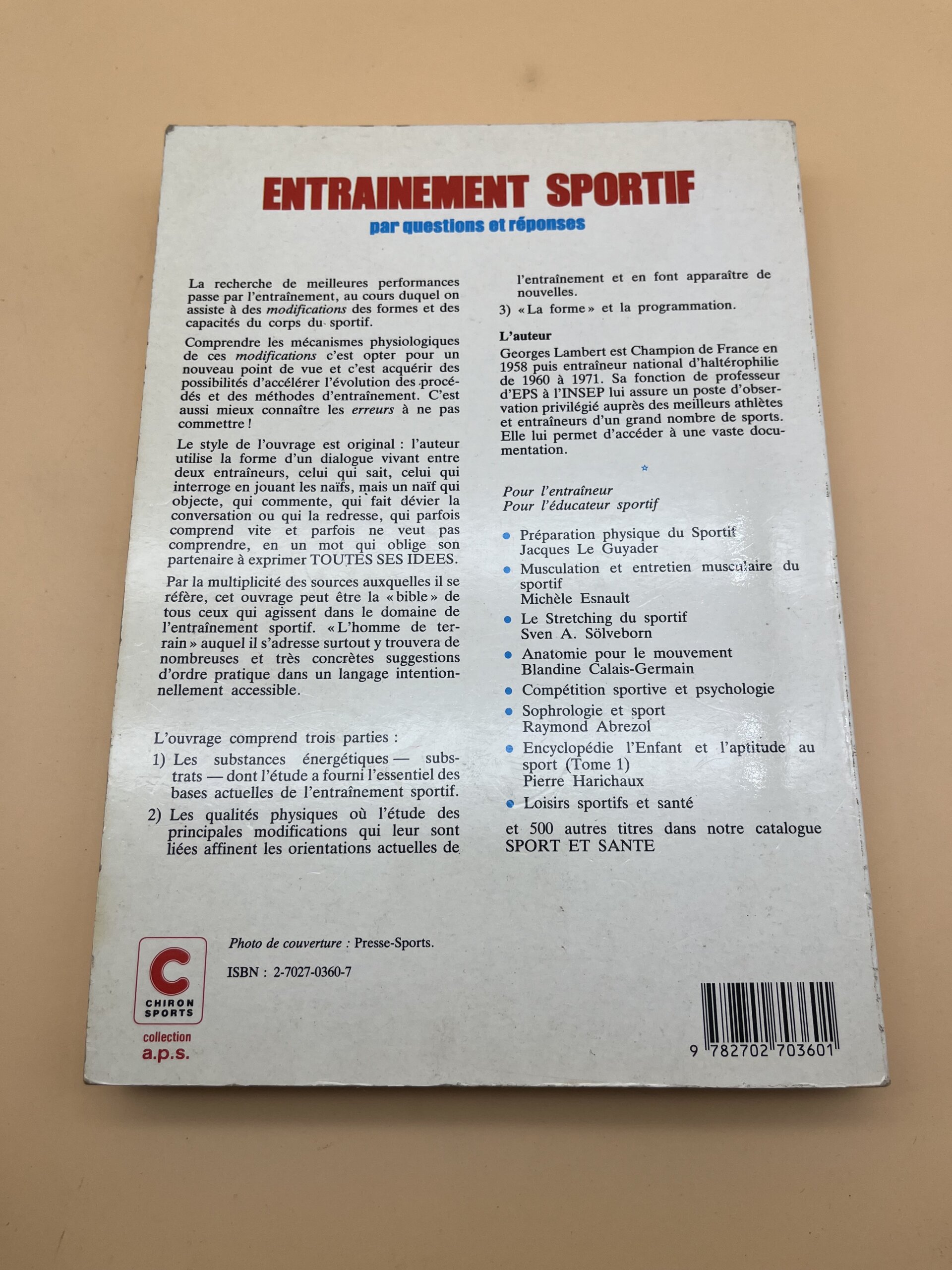 Trouvez des réponses claires et concises à toutes vos interrogations sur la préparation physique. Georges Lambert adopte une approche originale sous forme de questions-réponses pour traiter des thèmes clés de l’entraînement : planification, récupération, diététique et physiologie. Ce format interactif rend la théorie accessible et directement applicable. Un manuel pratique aux éditions Chiron, utile pour les sportifs curieux et les éducateurs en formation.