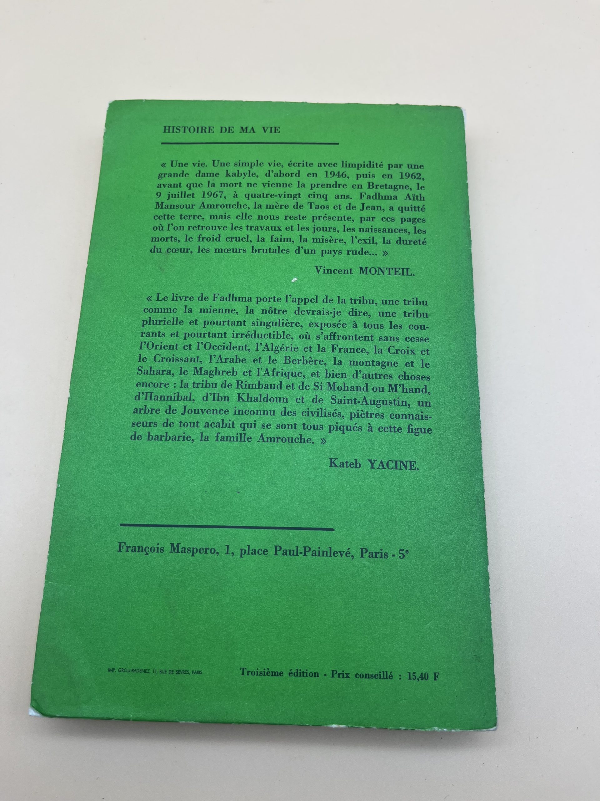 L’autobiographie de Fadhma Aït Mansour Amrouche chez Maspero; un texte majeur de la littérature maghrébine.