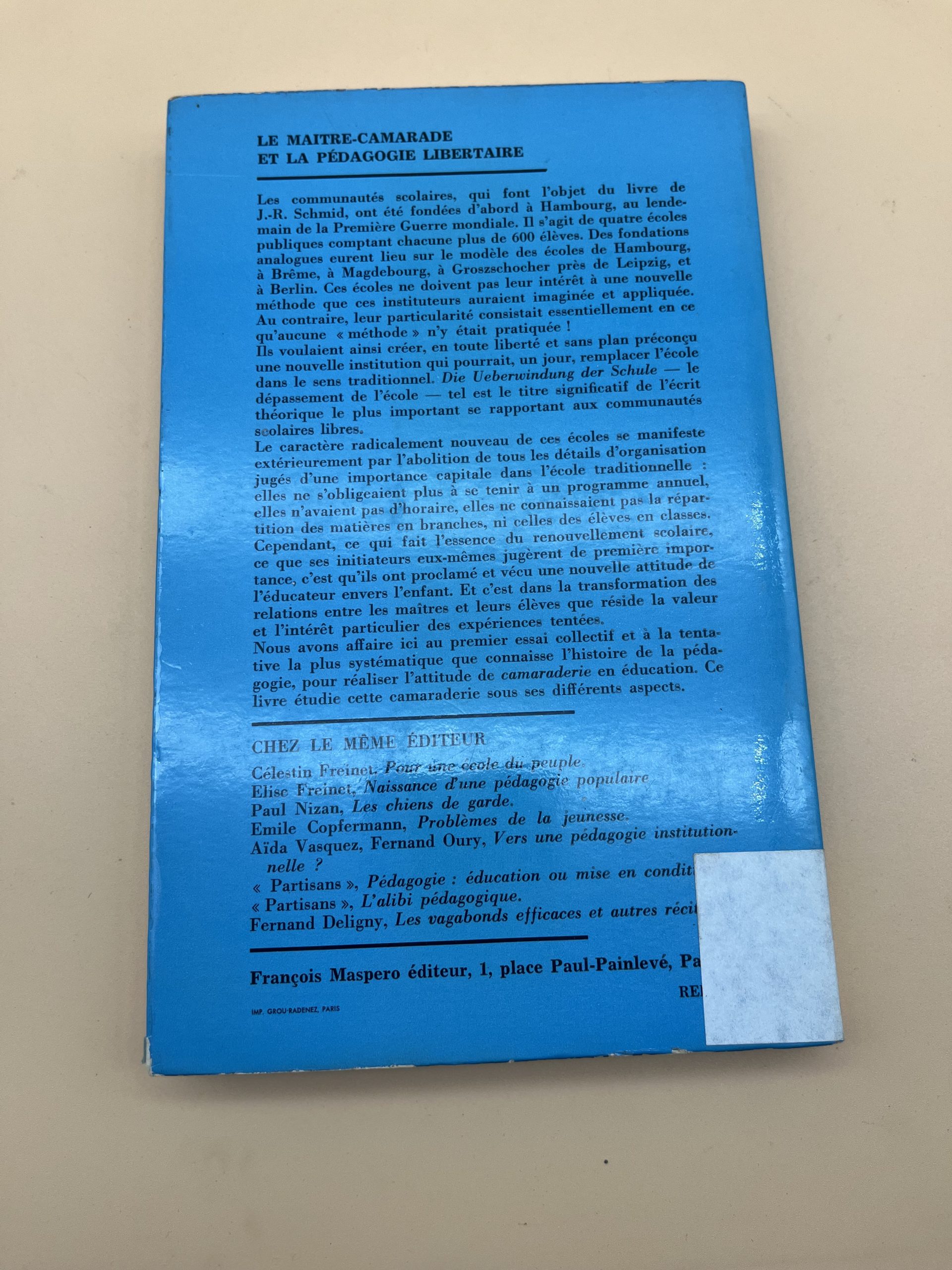 Livre de J.R. Schmid sur la pédagogie libertaire et le maître‑camarade, réédité chez François Maspero, référence pour l’éducation alternative.