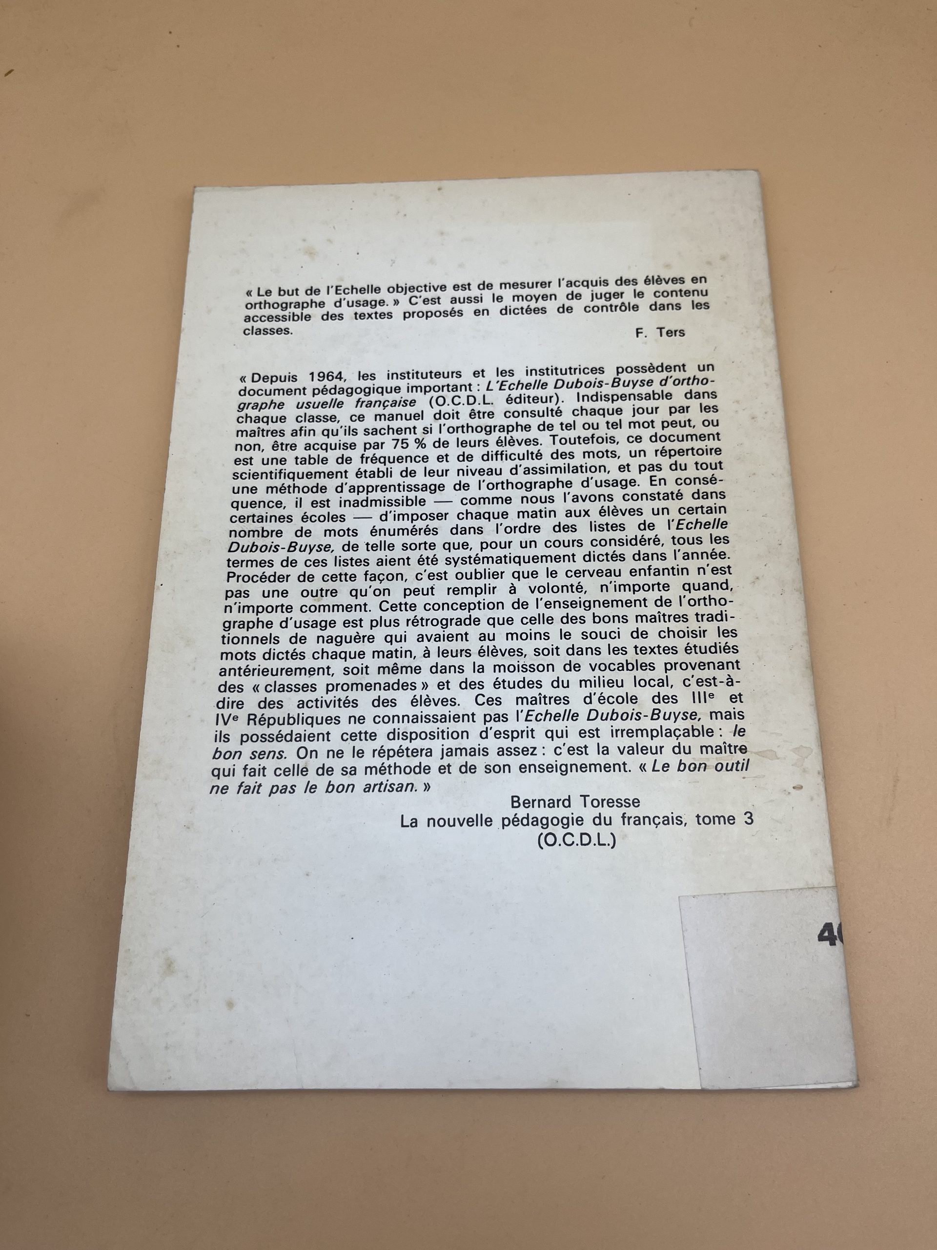 Outil didactique fondamental, l’échelle Dubois-Buyse classe plus de 3000 mots courants selon leur difficulté orthographique. Cette 6ème édition révisée aux éditions MDI permet aux enseignants de construire des dictées et des exercices adaptés au niveau réel des élèves, du CP au collège. C’est un instrument indispensable pour tout professeur des écoles soucieux de faire progresser sa classe en orthographe de manière rationnelle et progressive.