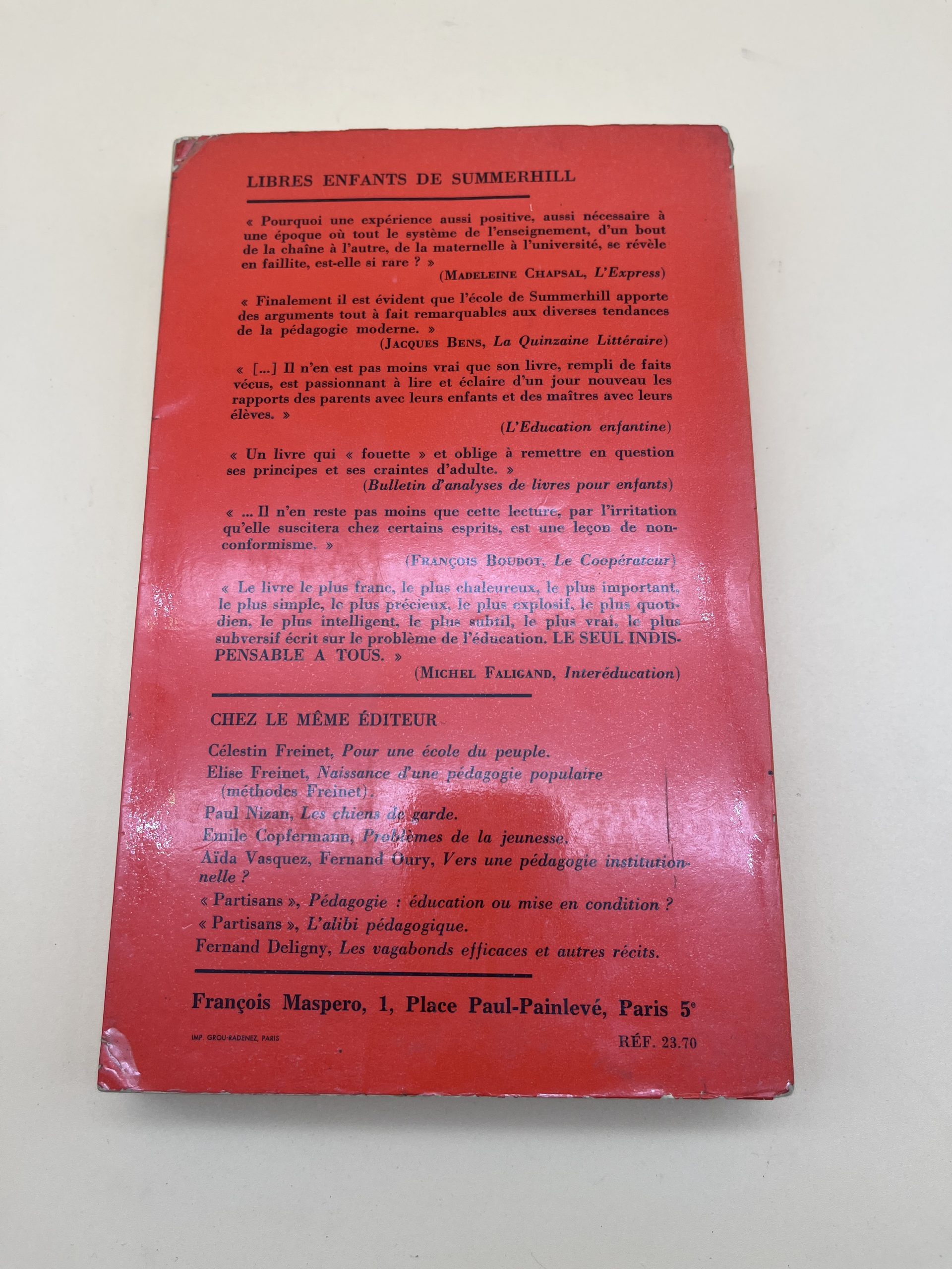 Le célèbre ouvrage d’A.S. Neill (Maspero) sur l’expérience pédagogique libertaire de l’école de Summerhill.