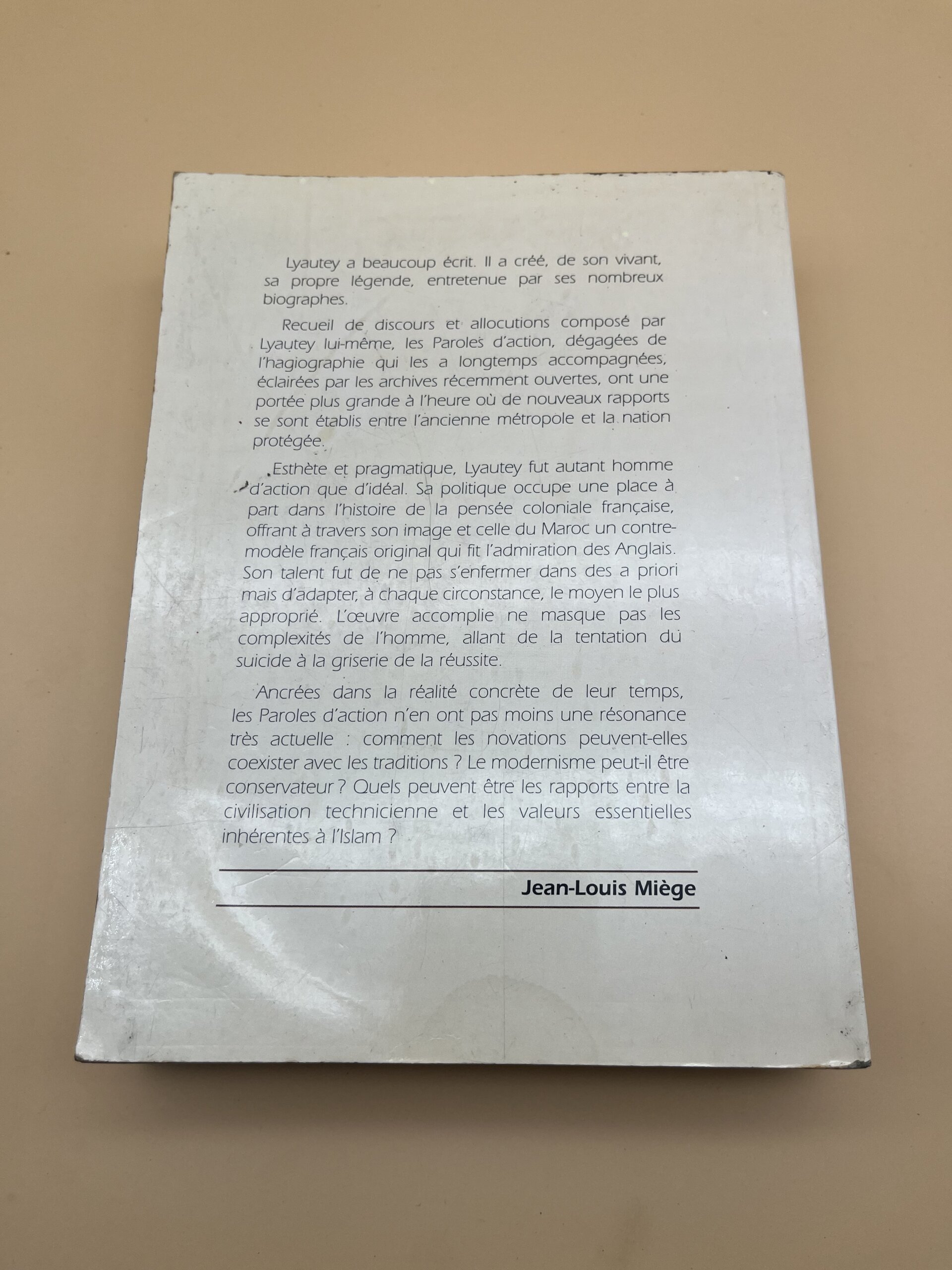 Recueil de discours et textes du maréchal Lyautey, résident général du Maroc durant le protectorat français. Cet ouvrage éclaire la vision politique et administrative de Lyautey et son rôle dans la structuration du Maroc moderne sous administration française. Une source essentielle pour l’étude du protectorat et de l’histoire coloniale du Maroc.
