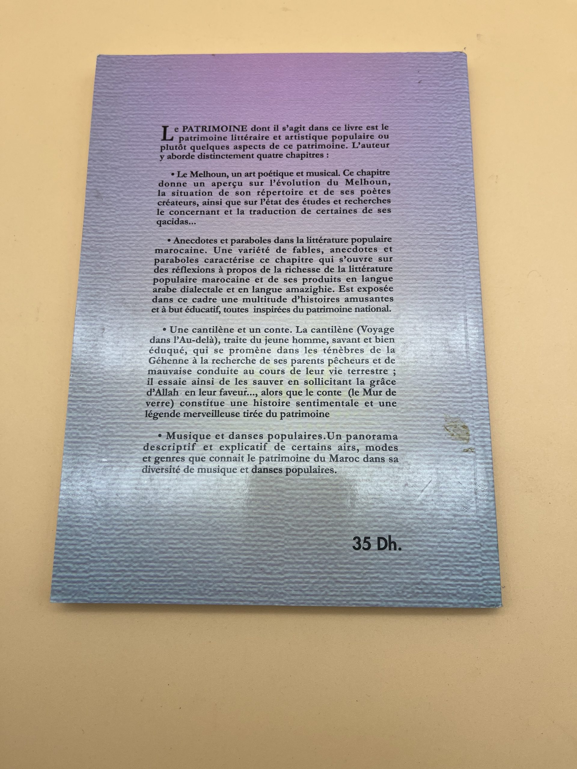 Description : Dans ce livre consacré au patrimoine marocain, Abdallah Chakroun, pionnier du théâtre et de la radio, rassemble souvenirs, récits, contes populaires, chants de Melhoun, musique et danses traditionnelles. L’ouvrage met en valeur la mémoire orale, la culture populaire et les arts du spectacle au Maroc, indispensable pour chercheurs, étudiants et passionnés de folklore maghrébin.