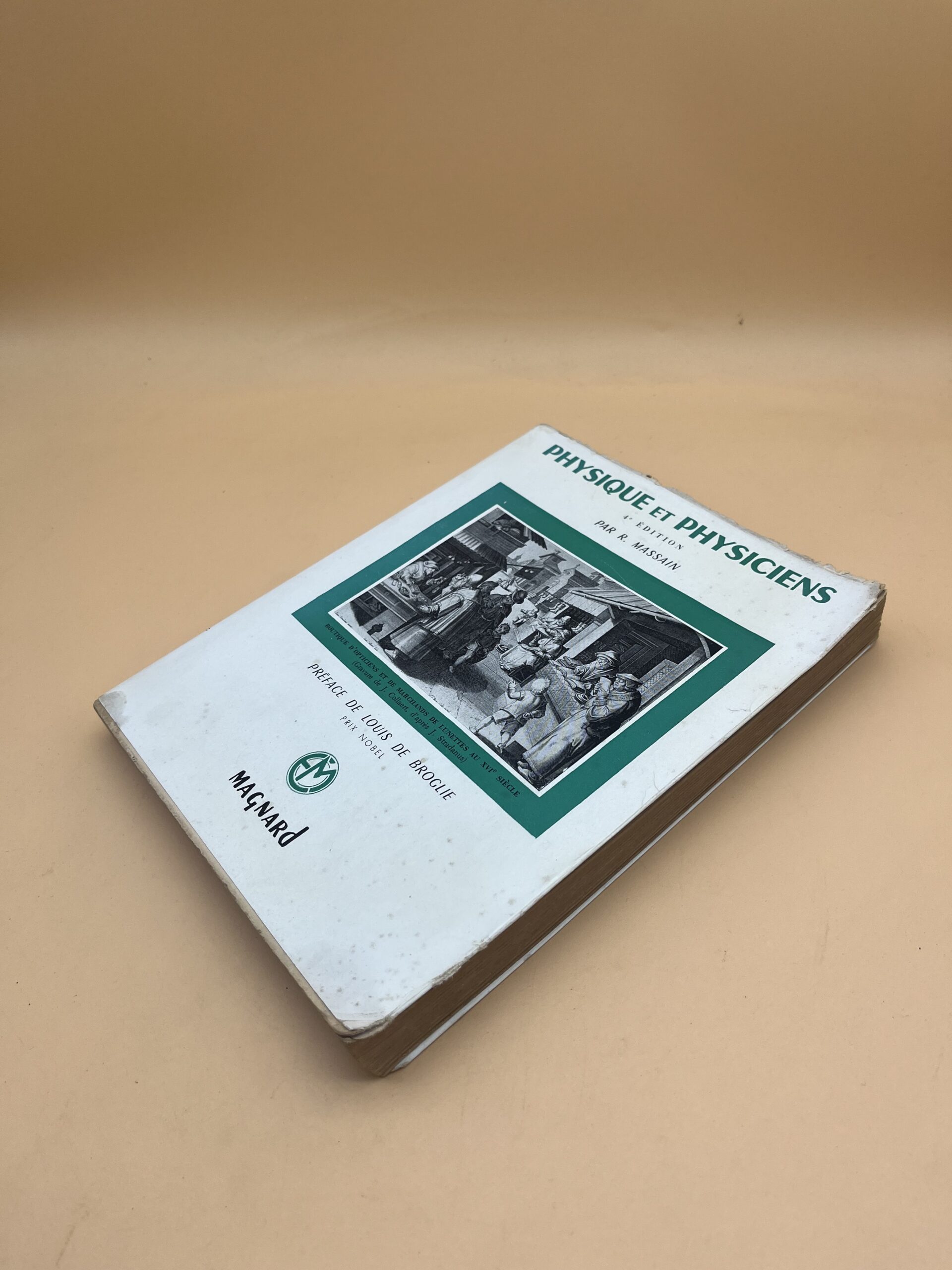 « Physique et physiciens » de R. Massain est un ouvrage historique majeur publié aux éditions Magnard avec une préface prestigieuse de Louis de Broglie, Prix Nobel de Physique. Cette 4ème édition retrace l’histoire passionnante de la physique et des grands physiciens à travers les âges, depuis l’Antiquité jusqu’au milieu du XXe siècle. Le livre explore l’évolution de la science physique, les découvertes fondamentales en mécanique, électricité, thermodynamique, optique et physique moderne, tout en présentant les biographies des savants illustres qui ont révolutionné notre compréhension de l’univers. Richement illustré avec gravures historiques, figures scientifiques, tableaux explicatifs et photographies d’époque, cet ouvrage de référence de 398 pages constitue un document exceptionnel pour comprendre le développement de la pensée scientifique. Édition vintage Magnard en bon état, avec illustration de boutique d’opticiens du XVIe siècle en couverture, livre rare pour collectionneurs et passionnés d’histoire des sciences.