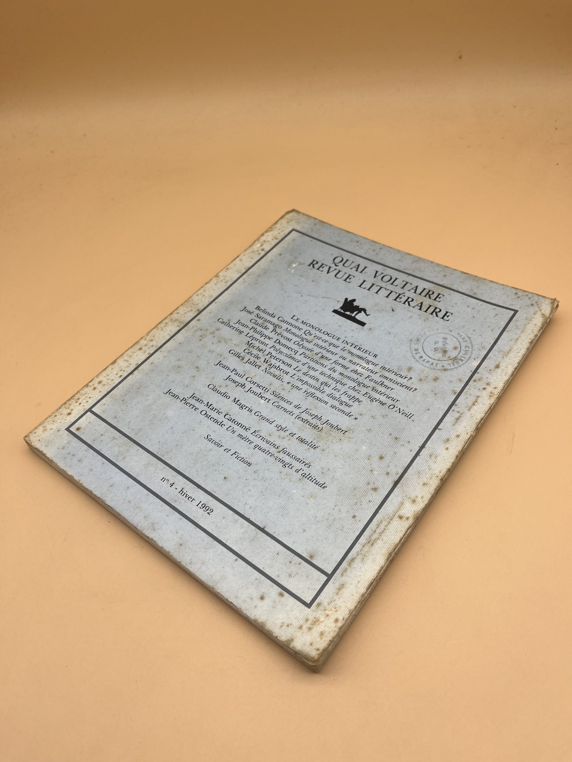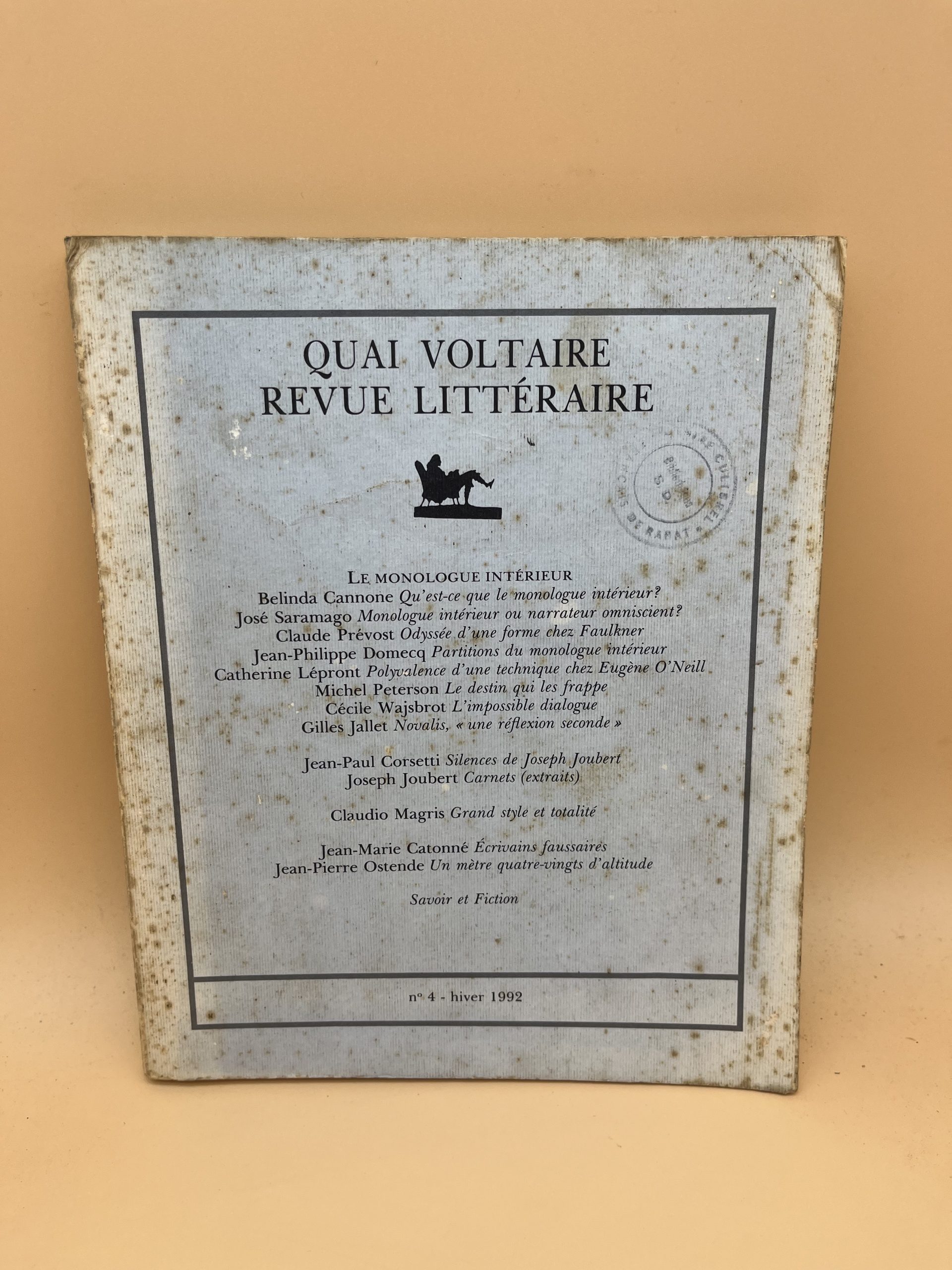 Numéro 4 de la revue littéraire Quai Voltaire, paru à l’hiver 1992. Recueil de textes et critiques littéraires. Format broché idéal pour collectionneurs.