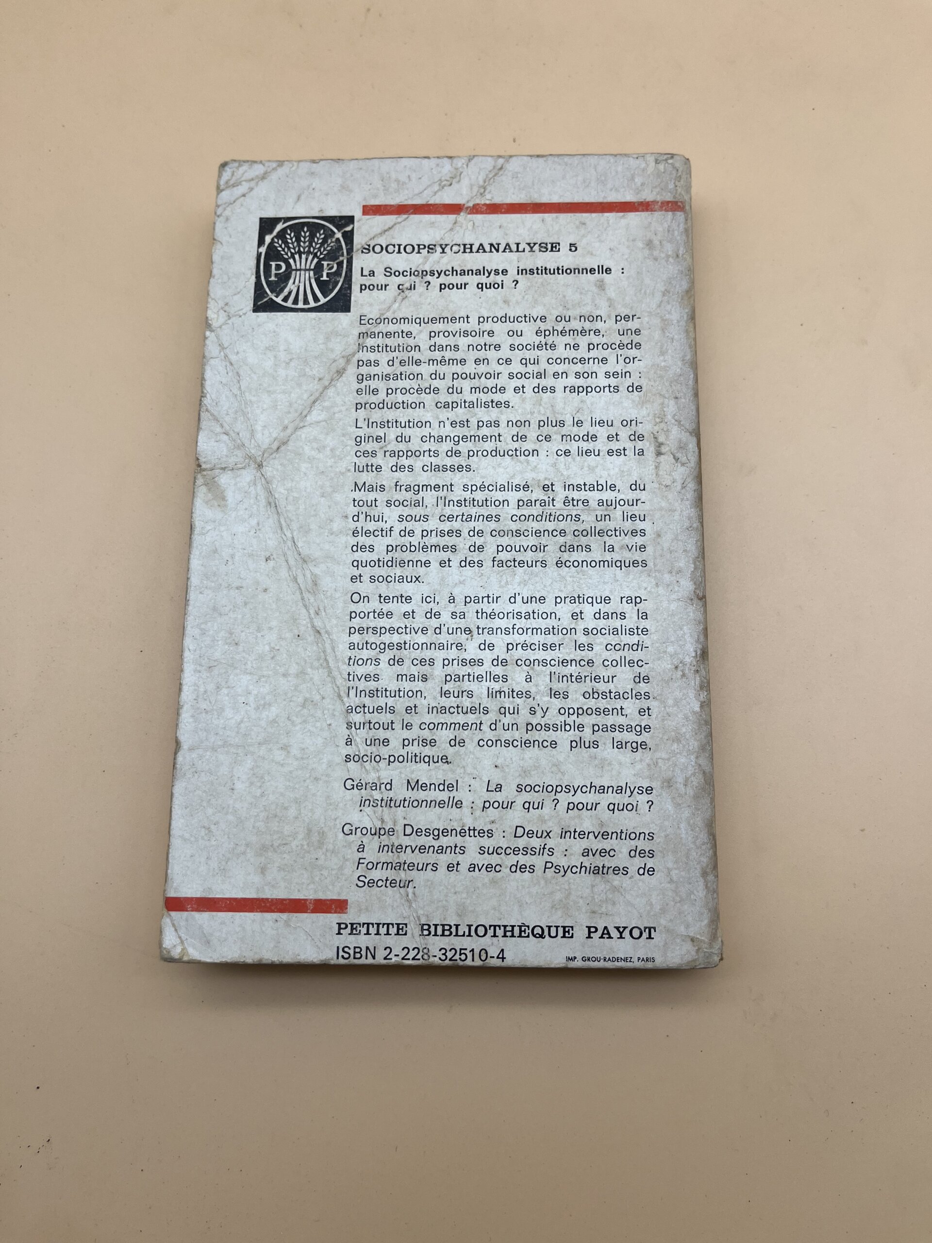 Gérard Mendel poursuit ici son travail novateur de sociopsychanalyse en l’appliquant aux institutions. Il interroge la place de l’autorité, du pouvoir et de l’inconscient dans les structures sociales (école, entreprise, hôpital). Publié dans la Petite Bibliothèque Payot, ce tome 5 est un outil précieux pour comprendre les dynamiques institutionnelles et politiques.